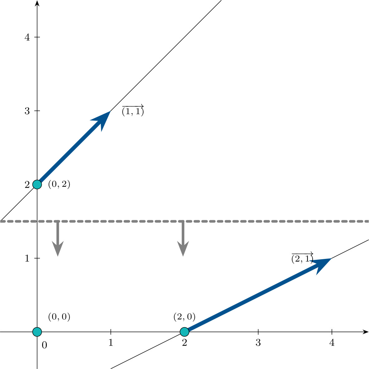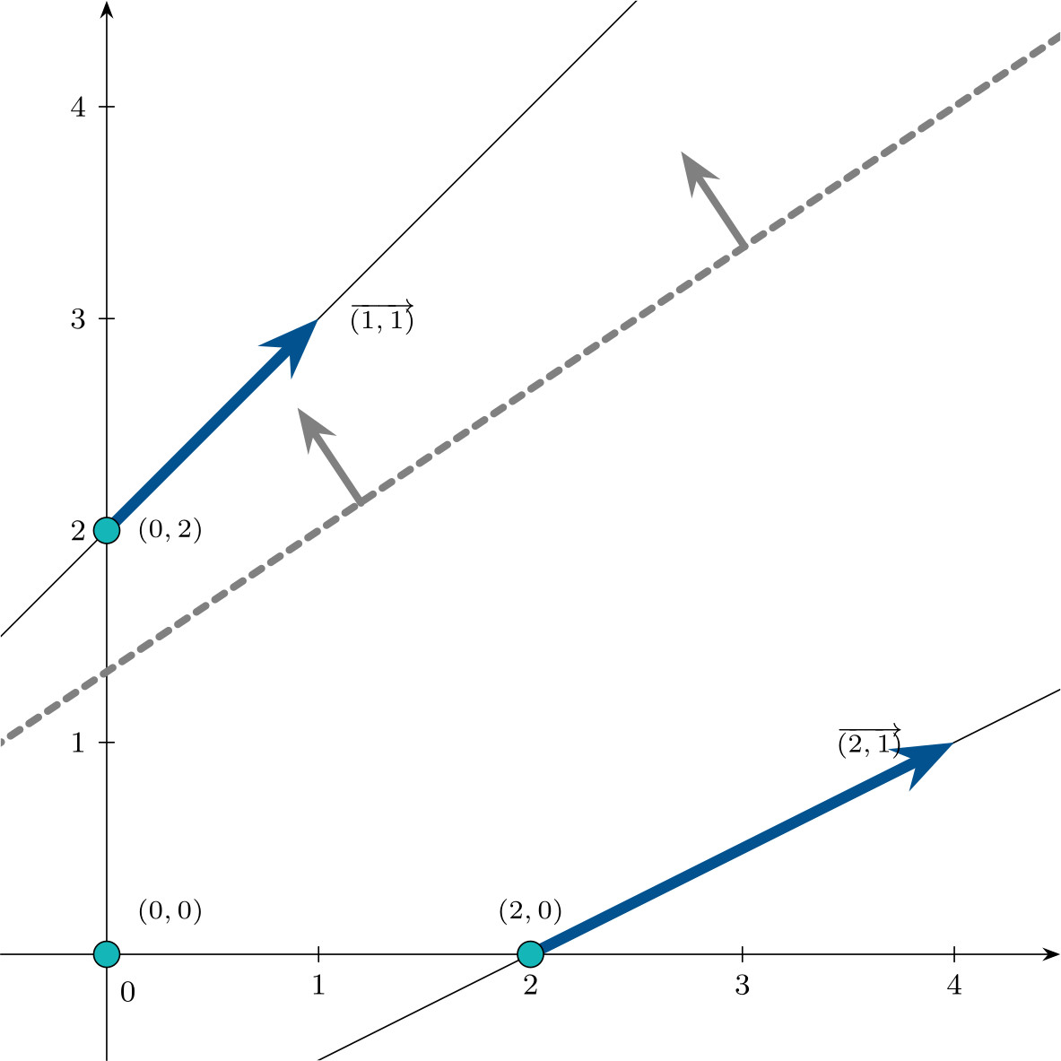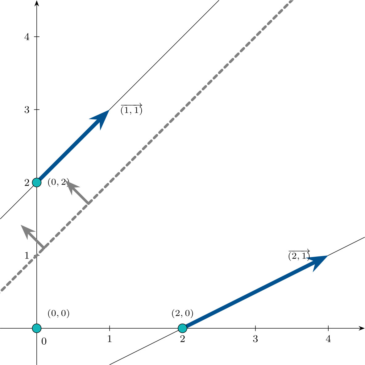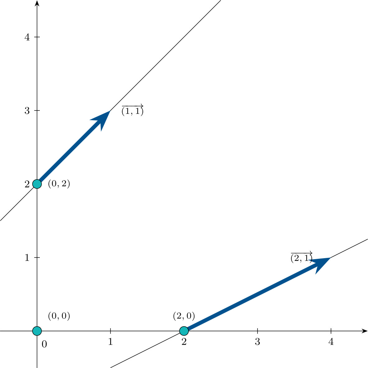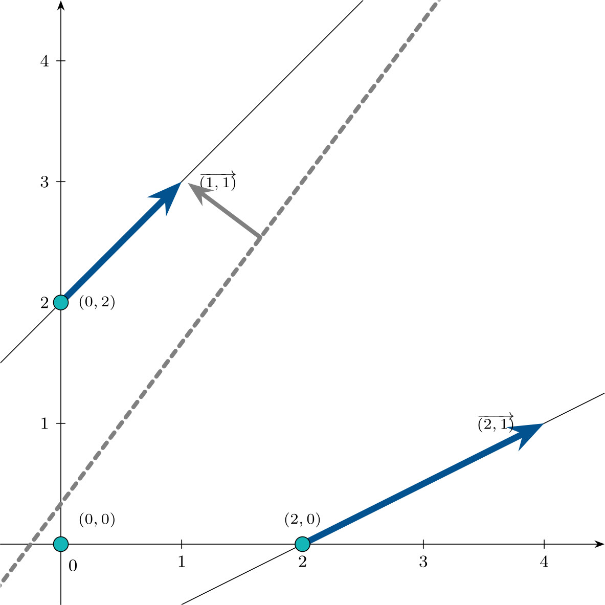 \[\mathbf{d}_1 = \begin{pmatrix}1 \\ 1 \\ 0 \\ 1\end{pmatrix} \qquad \mathbf{d}_2 = \begin{pmatrix}2 \\ 1 \\ 1 \\ 0\end{pmatrix}\]represented in the following figure in $\mathbb{R}^2$:
